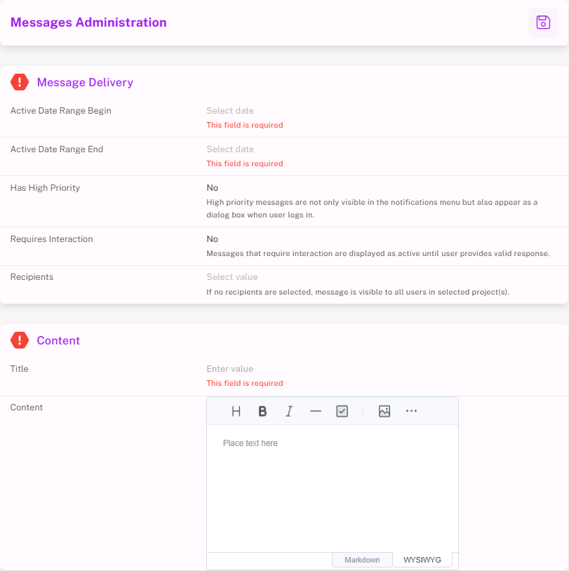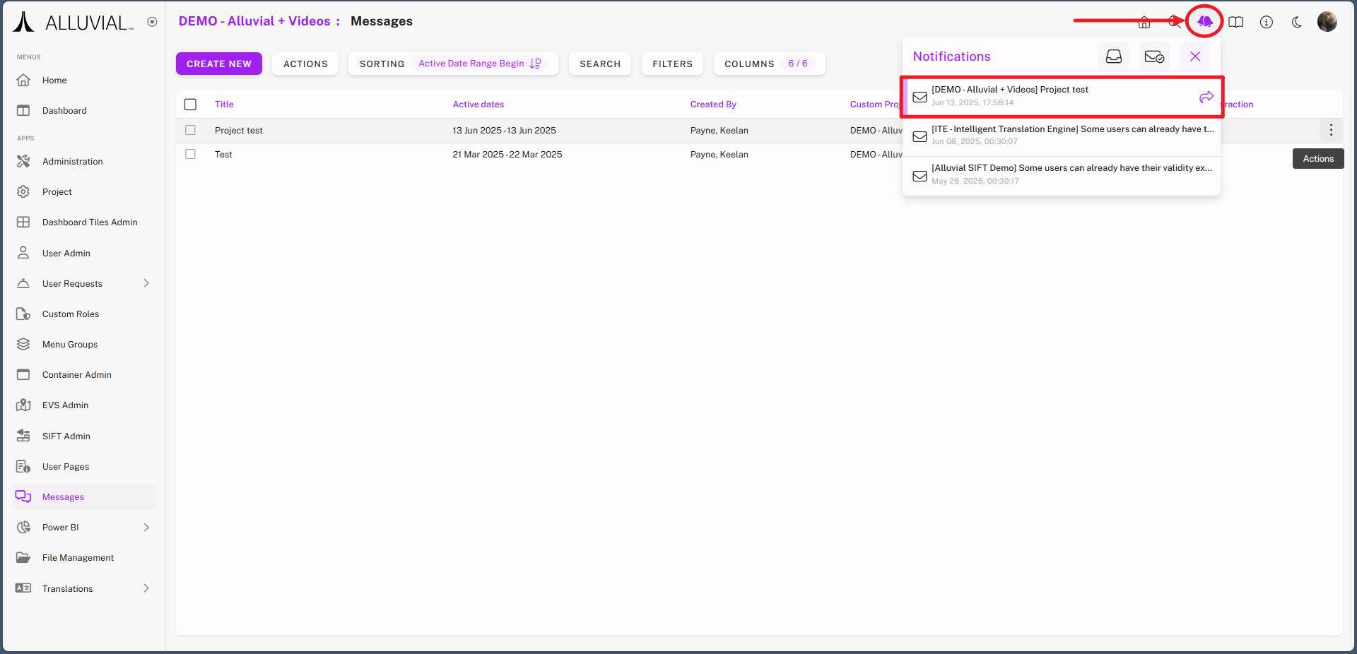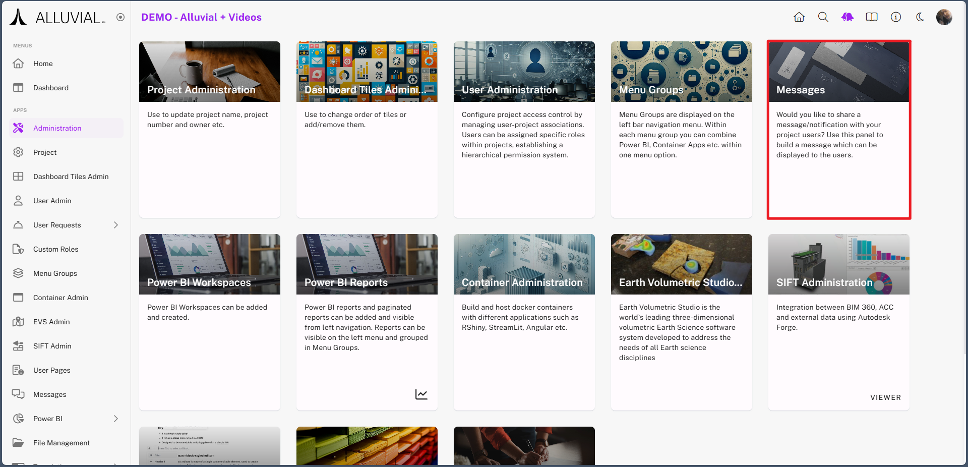 The Messages feature allows project administrators to send notifications to all users within a project.