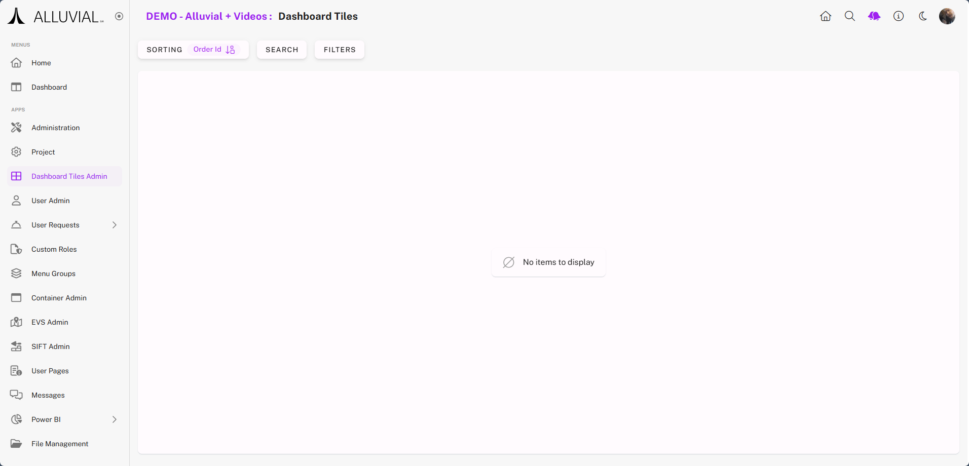 If no items are enabled as tiles, the Dashboard Tiles admin page will appear blank.