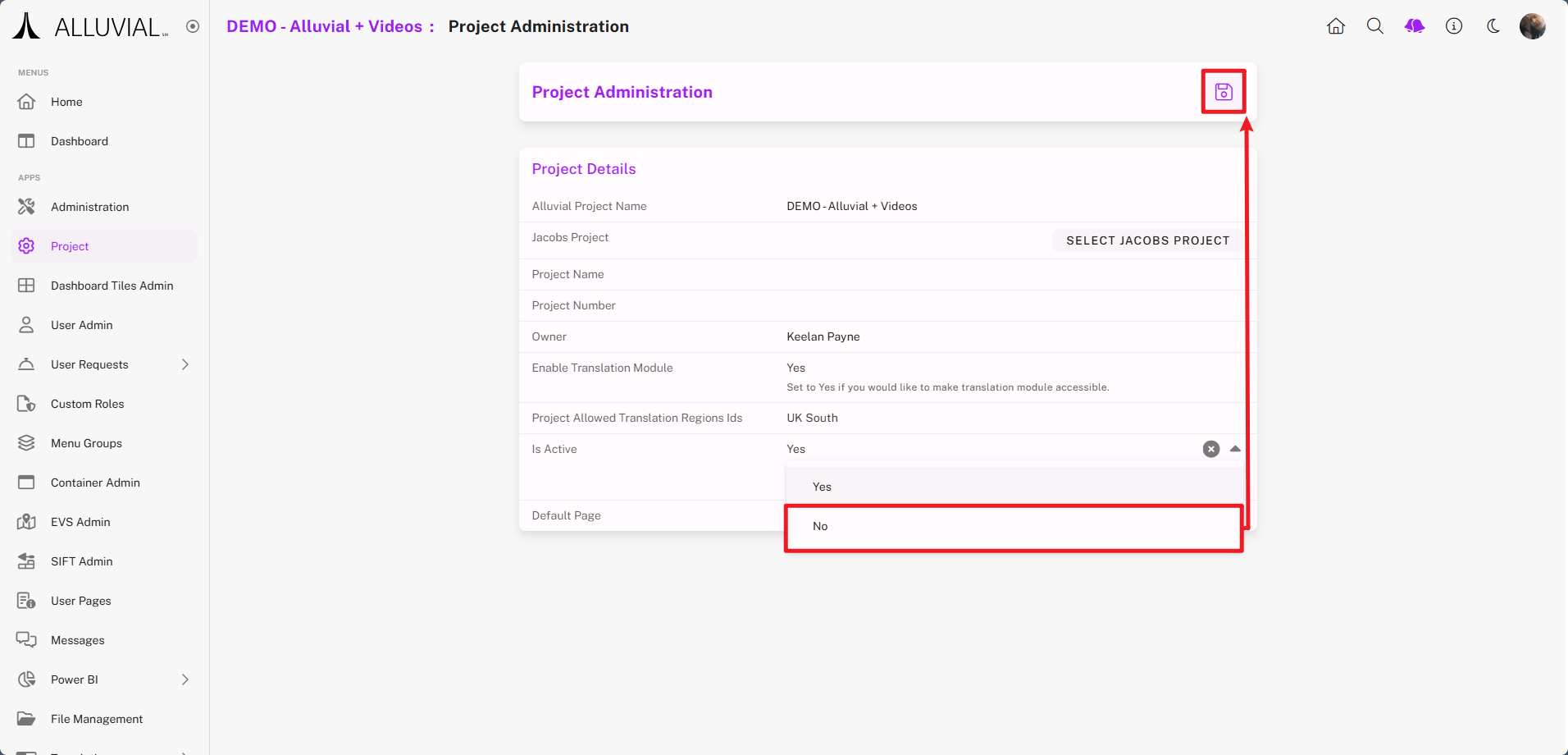 The Is Active setting controls whether the project remains active in Alluvial. Setting this value to No effectively archives the project within the platform.