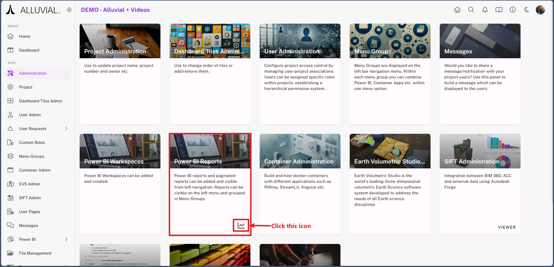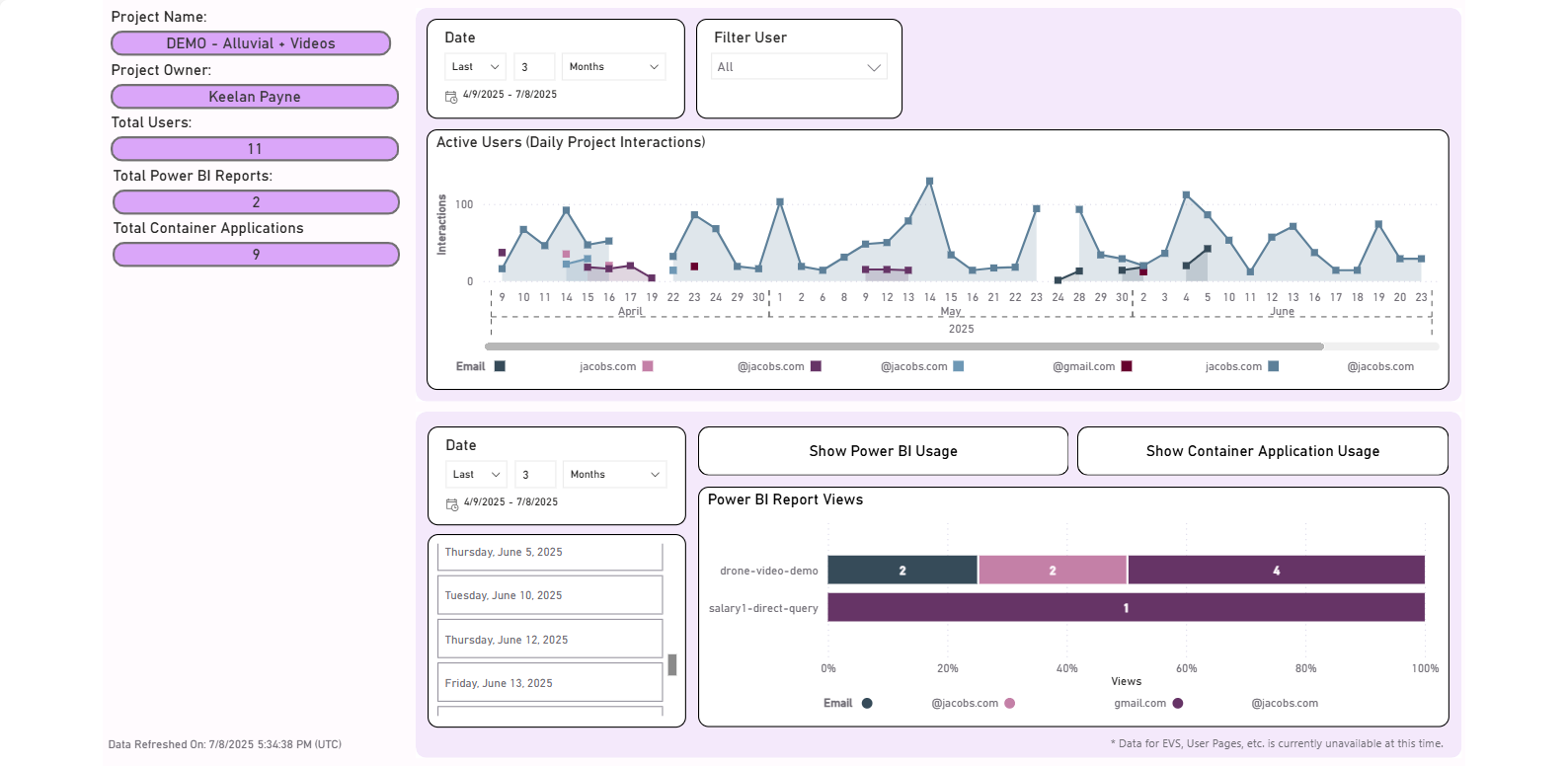 Use the dashboard to review how users are interacting with Power BI reports, container applications, and project content over time.